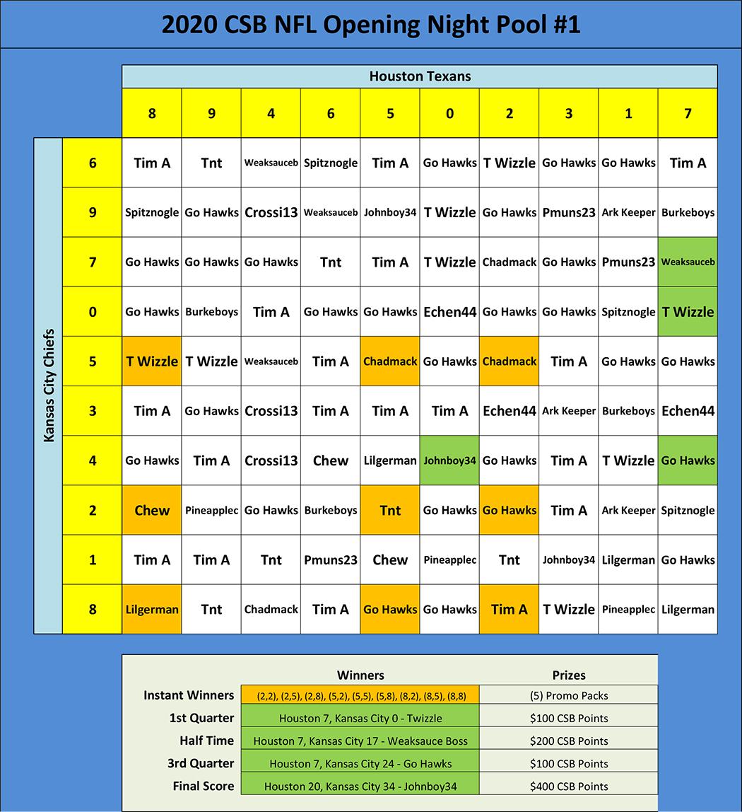 Below are our 2020 NFL Opening Night Squares Pools! After the breaks are full and teams are randomed we will fill it out live!