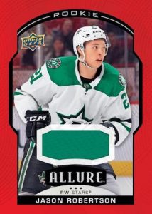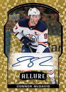 Allure, now in its second season following a very successful 2019-20 debut, sports a 150-card Base Set featuring 70 Veterans, 30 Rookies and 50 SP Rookies – the latter falling 1 per pack, on average. With numerous parallels ranging from simply color and pattern variations to color and pattern variations with autographs and/or memorabilia, Allure surely appeal to a wide variety of collectors.