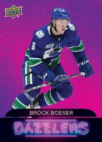 New! Dazzlers, a new addition in 2020-21, is a brightly-colored collection of full-bodied, popped-out active stars. There are two versions of each player – Blue (1 per box, on average) and Pink. Add the final 50 cards of each version to your collection!