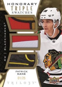 The triple-memorabilia cards are back! Look for Honorary Triple Swatches & Triple Relics insert cards #’d to 35, 25 or 10.