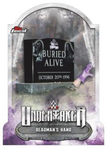 DEADMAN’S TOMBSTONE TRIBUTE: Highlighting 10 of the greatest moments from the legendary career of Undertaker. Each card die-cut will be shaped in Undertaker’s signature tombstone.