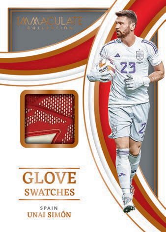 Returning for 2022-23 Immaculate Collection Soccer, Glove Swatches represent the goalkeepers in a memorabilia set, with each card containing a game-used swatch of glove.