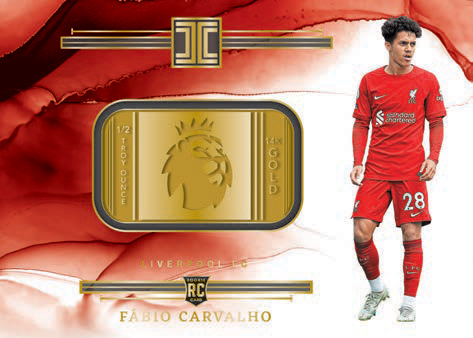 Featuring ingots of real precious metal embossed with the Premier League logo, find one gold or silver card per hobby case, on average.