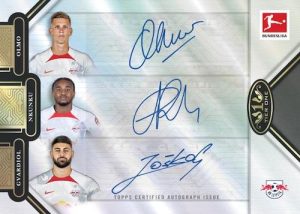 The debuting signature lines for 2022-23 Topps Tier One Bundesliga consist of Scarecrow Autographs (40 subjects; #/120), celebrating defensive standouts, and Xplosion Autographs (30 subjects; #/120), with “new and exciting Bundesliga players.”