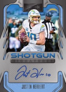 The Rookies Signatures set adds Hobby-exclusive parallels numbered to 99 or less. Shotgun Signatures is a new insert that celebrates quarterbacks, while Hash Marks offers another debut. Armory (#/49 or less) puts six memorabilia pieces on a vertical booklet design..