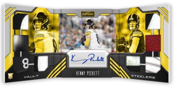 Showcasing a triple-panel design for rookies and veterans, the Vault Tri-Fold Jersey Autographs cards are limited to 25 copies or less.