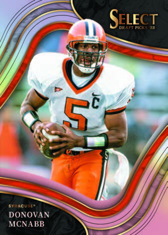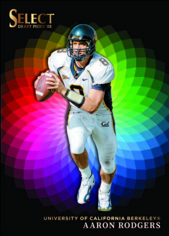 Select Collegiate Football debuts with several inserts and multiple parallels to chase featuring the newest rookie class from 2022 and today’s top stars in their collegiate attire. Hunt the SSP Color Wheel insert.