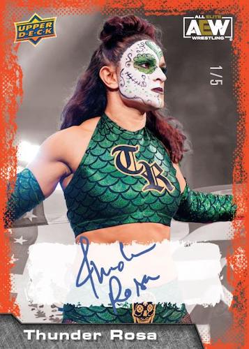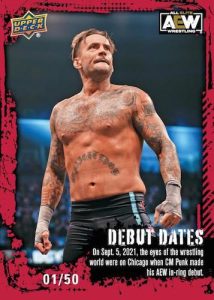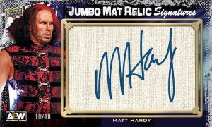 Fans and collectors alike will love the insert lineup, which includes four new and intriguing sets: UD Canvas: This classic insert, long cherished by hockey collectors, is now an AEW staple. Each box contains, on average, four regular UD Canvas cards and one all-new Gold parallel! Main Features: Back after a successful 2021 debut, this set features all of the top wrestlers on the roster. Collect up to six parallels: Silver, Green (#’d to 199), Red (#’d to 50), Purple (#’d to 25) and Gold Spectrum (#’d 1-of-1). NEW! Debut Dates: Each card highlights the debut of some of the top recent additions to the AEW roster. Collect up to three parallels, including Red (#’d to 50) and Gold Spectrum (#’d 1-of-1) parallels. NEW! Outside the Ring: This set captures wrestlers outside of the ring. Look for Silver, Red (#’d to 50) and Gold Spectrum (#’d 1-of-1) parallels.NEW! AEW Breakouts: Each card in this acetate set features the biggest names in AEW today and will be a valuable addition to any collection. Keep an eye out for rare SP’s! NEW! Jumbo Mat Relic Signatures: Everyone will be chasing after a redemption card for one of these low-#’d and oversized (3″ x 5″) cards featuring a large mat relic and a hard-signed autograph from an AEW superstar!