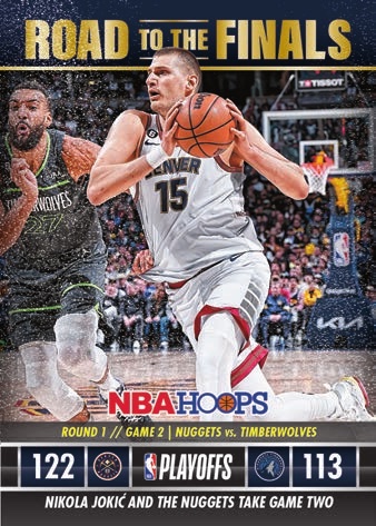 The 2023 NBA playoffs are also recapped, from start to finish, via 2023-24 Panini NBA Hoops Basketball inserts only available in Hobby boxes. Ending with a celebration for the Denver Nuggets, the lineup consists of Road to the Finals, Championship Moments, Finals MVP, Champions, and Parade.