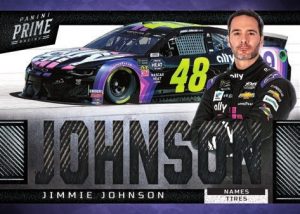 Find 4 different base cards including Base, Hall of Fame, Champions, and Trackside Collection. Look for single, double, triple, and quad swatch cards featuring tire, sheet metal, or firesuit. Hunt for the Names and Nicknames memorabilia sets featuring a die-cut swatch window that spells out the driver’s name.