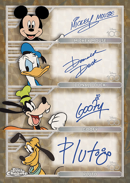 - Also look out for special insert cards, including 1/1 “Platinum Characters” and “Mickey and Friends” cards, sequentially numbered to 23, plus dual autograph cards and quad autograph cards.