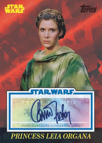 The product offers Chrome Sticker Reprints for the 55-sticker set. Among the new additions, the Return of the Jedi Cast Autographs line features stars from the movie, such as Carrie Fisher (Princess Leia Organa), Harrison Ford (Han Solo) and Mark Hamill (Luke Skywalker).