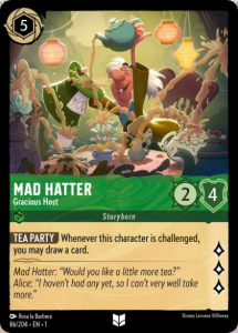 Items are played for their ink cost and put on the field above the inkwell. They come out ready and face up. They have unique abilities and can often be used turn after turn. You can play multiple items a turn if you can pay the ink. Item cards stay on the field until discarded or banished by their cost or another card’s ability. They can’t be targeted in challenges, and don’t have Lore, strength, or willpower stats.