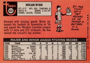 - Upon release, the 664-card 1969 Topps Baseball checklist was the largest in the history of the sport. Although the sheer quantity is enough to make it stand out, ’69 Topps’ strong popularity is due to the many Hall of Fame names in the checklist, including Nolan Ryan’s first single-player Topps card.