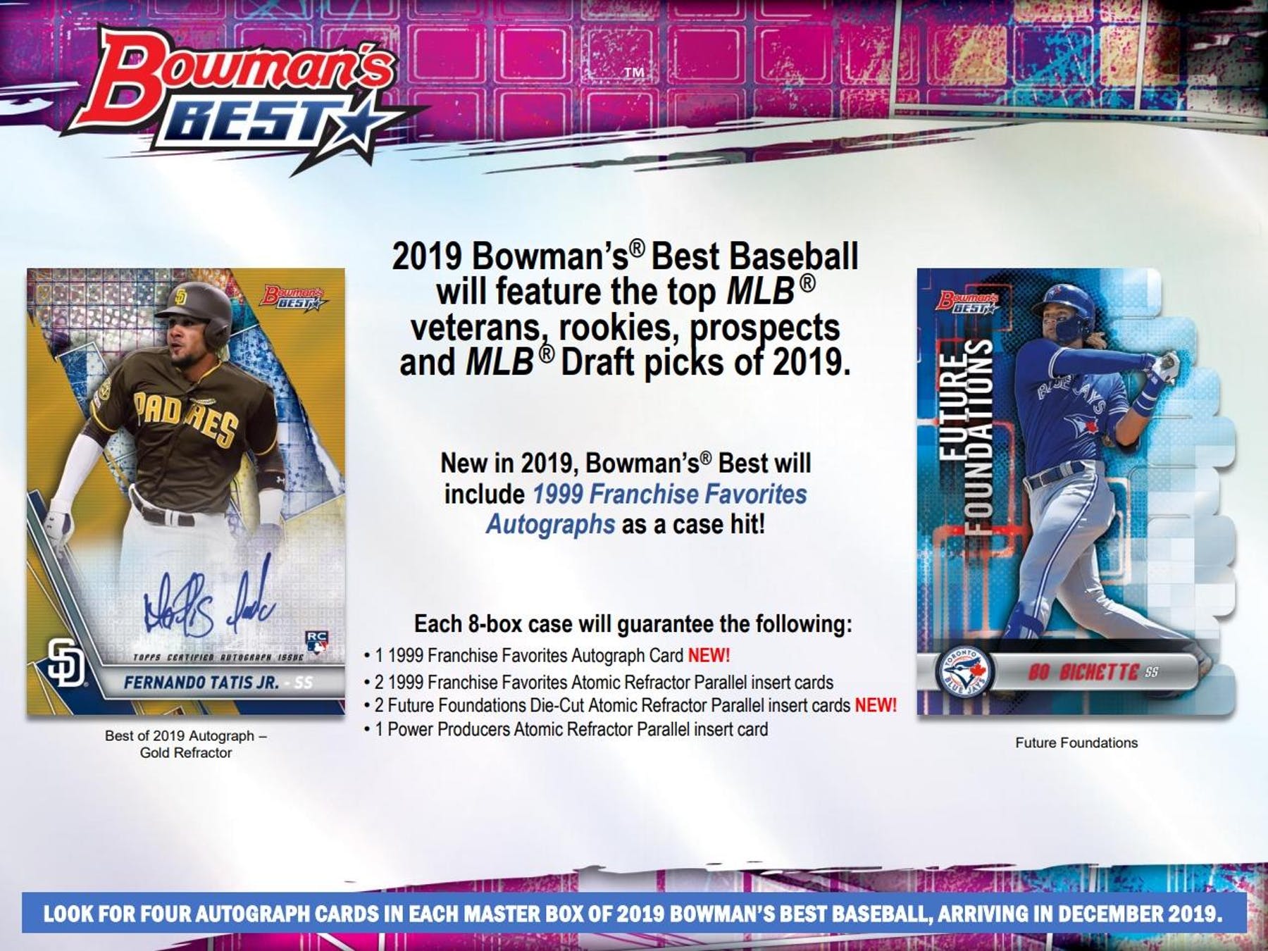 Showcasing a checklist including the year’s biggest veterans, rookies, MLB Draft picks and prospects, 2019 Bowman’s Best Baseball will contain FOUR ON-CARD autograph cards per master box!
