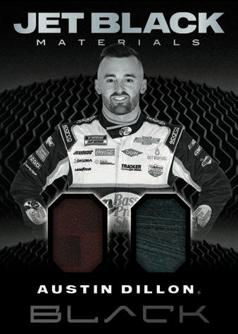 JET BLACK MATERIALS HOLO SILVER: Jet Black Materials features two swatches of race used memorabilia for numerous fan-favorite drivers!