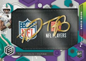 ROOKIE NEON MATERIAL SIGNS SHIELD: Look for trapped acetate autograph rookie cards, which parallel to jersey, prime and NFL Shield versions.