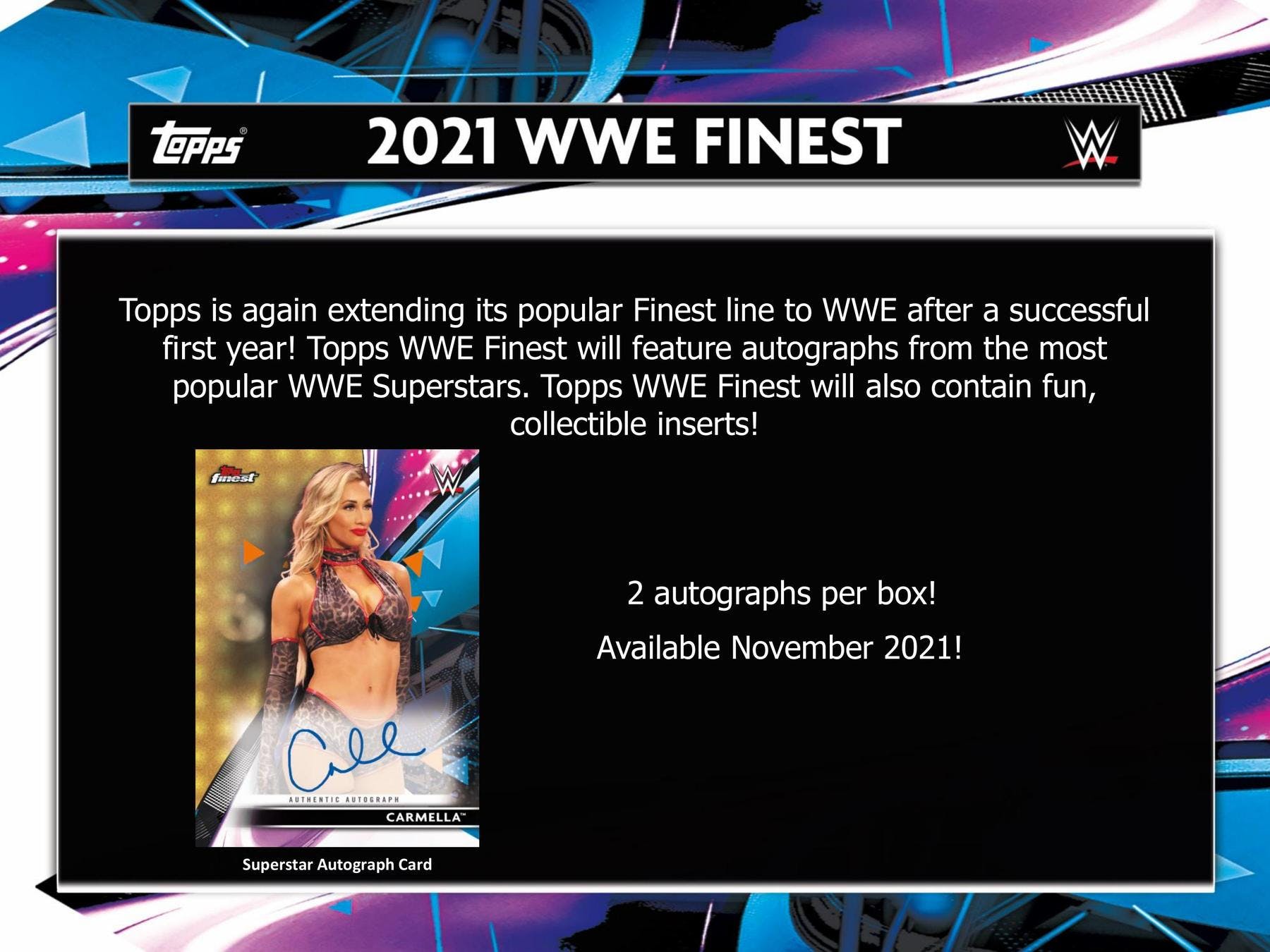 Topps is again extending its popular Finest line to WWE after a successful first year! Topps WWE Finest will feature autographs from the most popular WWE Superstars. Topps WWE Finest will also contain fun, collectible inserts!