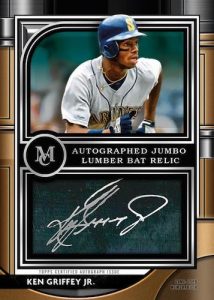 AUTOGRAPHED JUMBO LUMBER BAT RELICS: Up to 15 dynamic pairings with on-card autos and jumbo game-used patch pieces. Numbered 1 of 1.