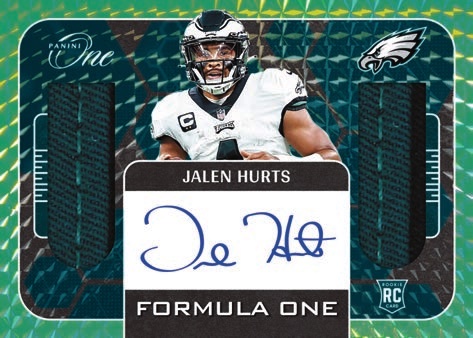 between two patches, Formula One Autographs features signatures from Stars such as: Michael Vick, J.J. Watt, Kam Chancellor, Jalen Hurts, and top Rookies from this year’s class.