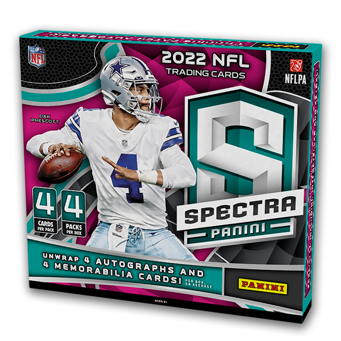 Returning in 2022- Spectra Football is back and includes: 4 Autographs, 4 Memorabilia Cards, 7 Base/Parallels, and 1 insert per box on average.
