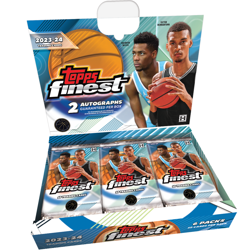 2023-24 Topps Finest Basketball makes its triumphant return to the hardwood after a 16-year hiatus. Each hobby box delivers 2 autographs, featuring signatures from the NBA’s most electrifying stars like Victor Wembanyama and LeBron James. Chase rare parallels including numbered Refractors, Die-Cuts, and coveted Superfractors. With a 300-card base set and stunning insert designs like Showstoppers and Arrivals, this release brings the premium Finest technology back to basketball collecting.