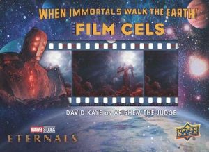 As for the premium options, 2023 Upper Deck Eternals has several choices. This includes a few different autograph styles. Eternal Ink is home to a variety of talent from the film. In addition, each Hobby box of 2023 Upper Deck Eternals contains one manufactured film cel relic. The When Immortals Walk the Earth Film Cels cards include four rarity tiers along with Gold (#/25) parallels and rare autographed versions.