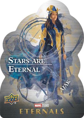Falling one per pack, inserts include Eternal Scenery, Eternals vs Deviants and Immortals & Mortals. Chase die-cut metal designs in Preliminary Profiles and Stars are Eternal. These combine to average one per case.