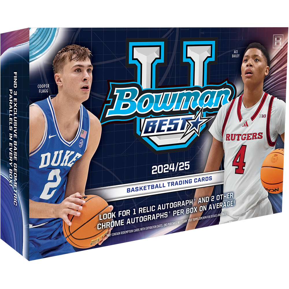 The 2024-25 Bowman University Best Basketball Hobby set brings the excitement of the latest college basketball season directly to collectors with a deep 100-card base checklist, rich parallel offerings, and a strong rookie and veteran lineup. This Hobby product is loaded with 4 autographs per box (including one patch autograph), eye-catching low-numbered parallels, and ultra-rare case-hit inserts exclusive to the Hobby format. Key players featured include Cooper Flagg (Duke), Ace Bailey (Rutgers), Dylan Harper (Rutgers), Juju Watkins (USC), and Boogie Fland (Arkansas), making this release a premier chase for prospect and star collectors alike.