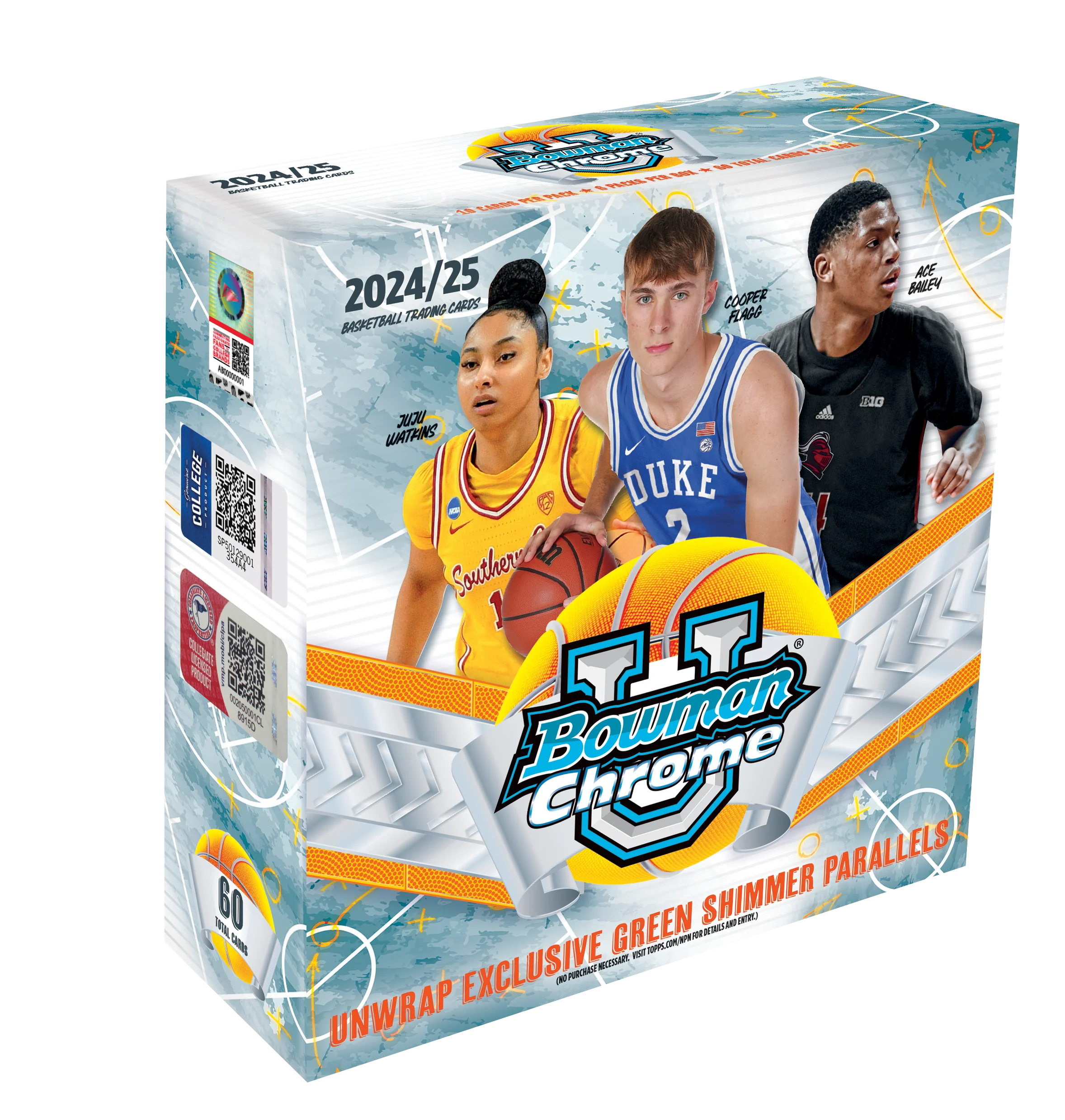 Experience the future of basketball with 2024-25 Bowman University Chrome Basketball Mega Boxes! This all-new, fully chromed release features officially licensed collegiate cards showcasing the brightest prospects from top college programs across the nation. Each Mega Box offers 60 cards of the highest quality chrome technology Bowman is known for.