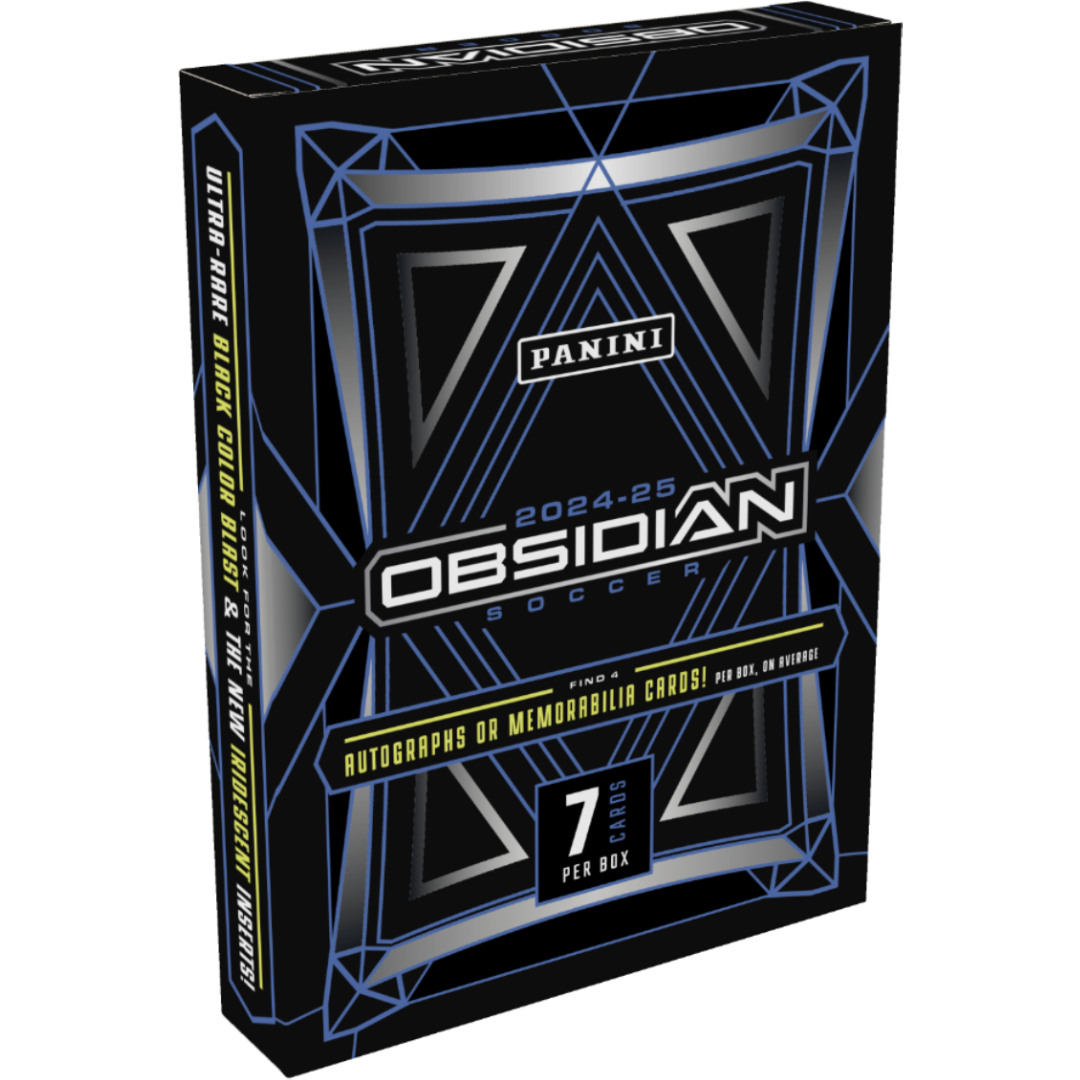 2024-25 Panini Obsidian Soccer Hobby Edition – 7 cards per pack, 1 pack per box. 4 autographs or memorabilia cards per box! Chase Electric Etch parallels and one-per-case Black Color Blast!