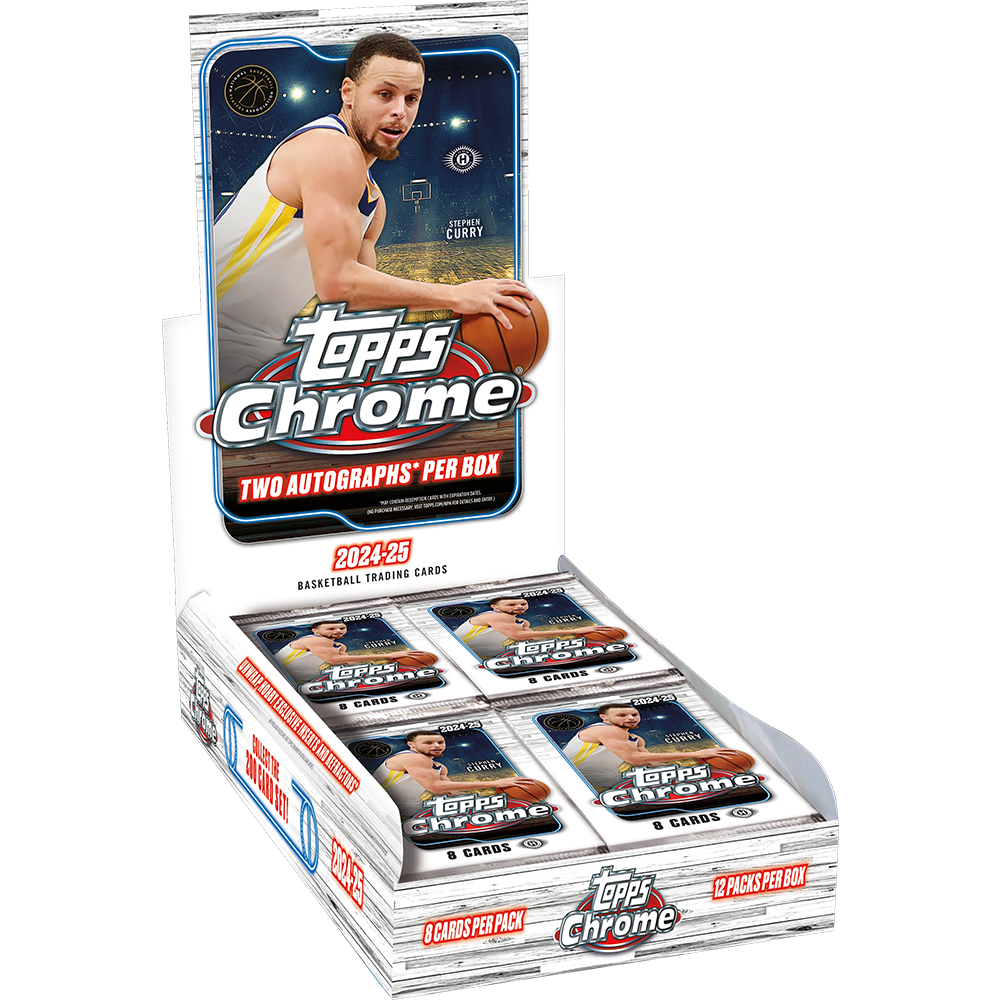 The 2024-25 Topps Chrome Basketball Hobby returns with a vibrant 200-card base set featuring the hottest rookies, current stars, and legendary icons. This Hobby SKU is highlighted by two autographs and a stunning array of base parallels and inserts in every box. Collectors can chase on-card signatures and ultra-rare SSP case hit inserts exclusive to Hobby. Find cards and autographs from standouts like Stephon Castle, Alexandre Sarr, Zaccharie Risacher, LeBron James, Victor Wembanyama, and Giannis Antetokounmpo.