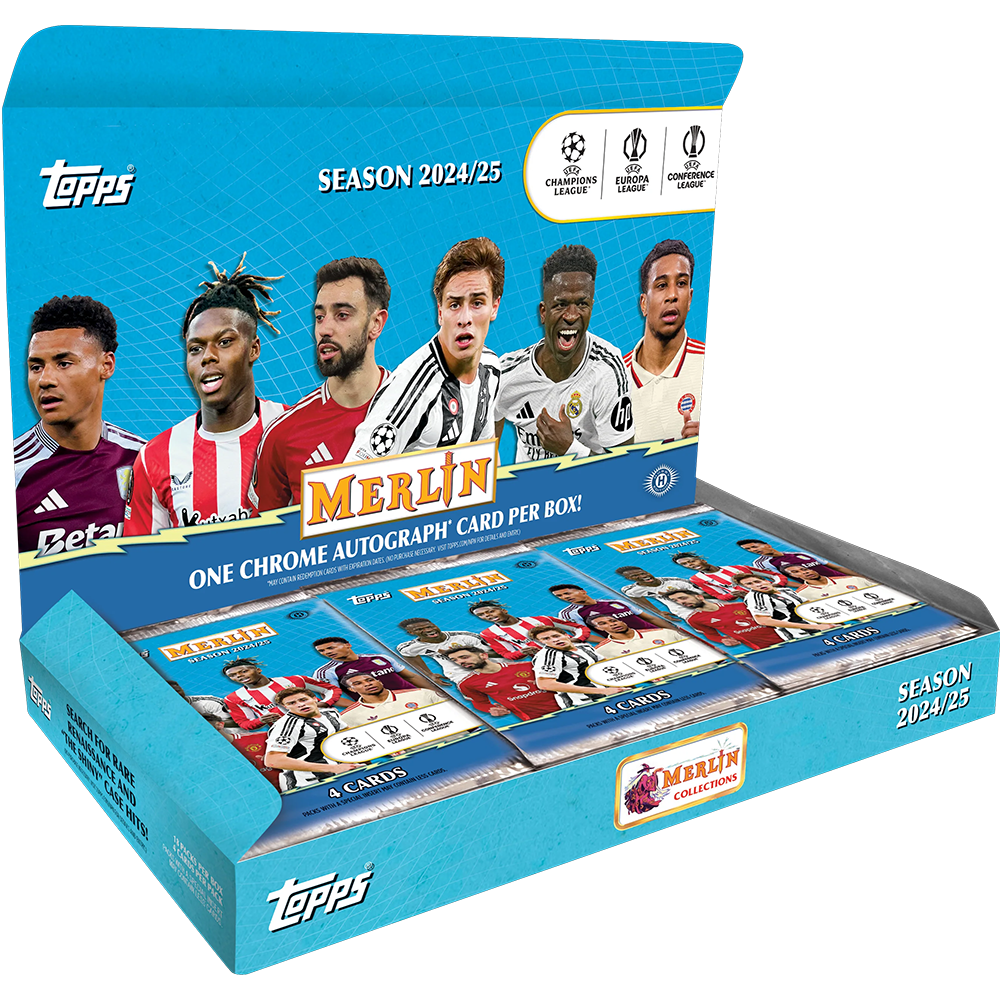 2024-25 Topps UEFA Club Competitions Merlin Soccer delivers 1 autograph, 3 numbered parallels, 2 refractors, and 4 exclusive Atomic Refractors per box. Look for Hobby-only Match Ball Signature relics, deep insert lineups, and a 200-card checklist featuring top rookies and superstars. Chase magical case hits and unique parallels!