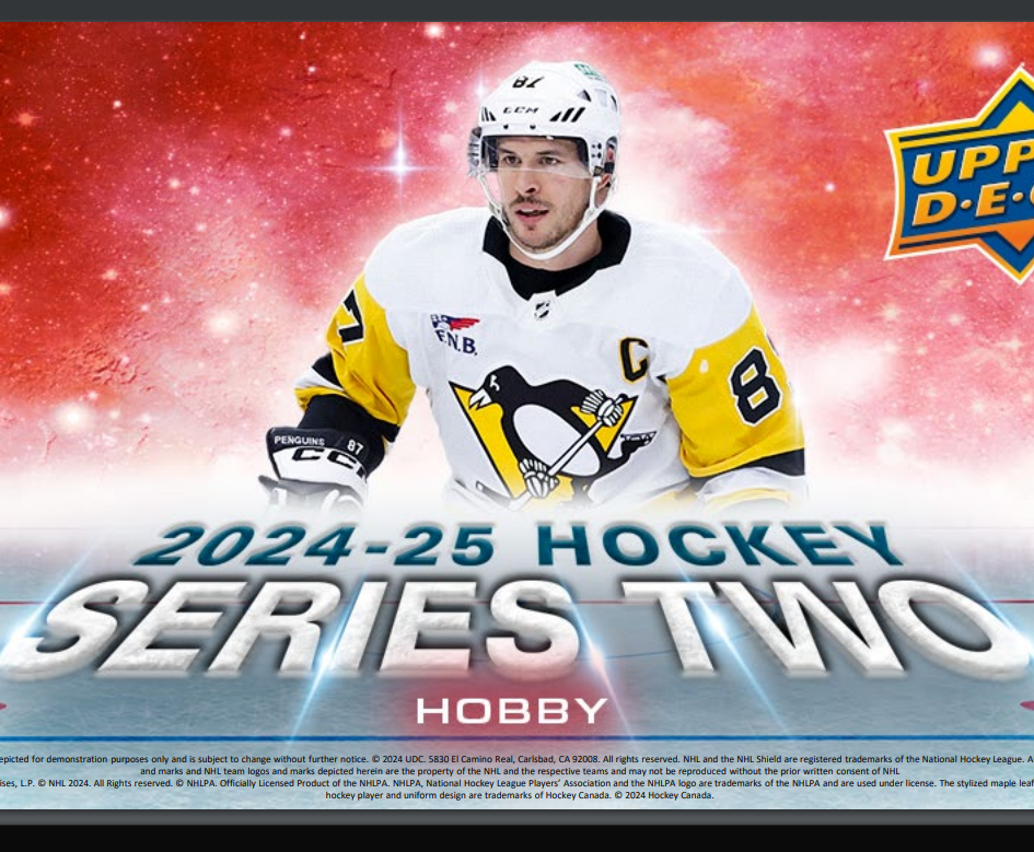 Upper Deck Series Two completes the 2024-25 hockey card set with 250 new cards, including the highly sought-after Young Guns rookies. Each hobby box contains 12 packs with a mix of base cards, inserts, and exclusive parallels, offering collectors a chance to pull rare hits like Outburst Gold and UD Canvas cards. Don’t miss the opportunity to own the next wave of NHL’s rising stars!