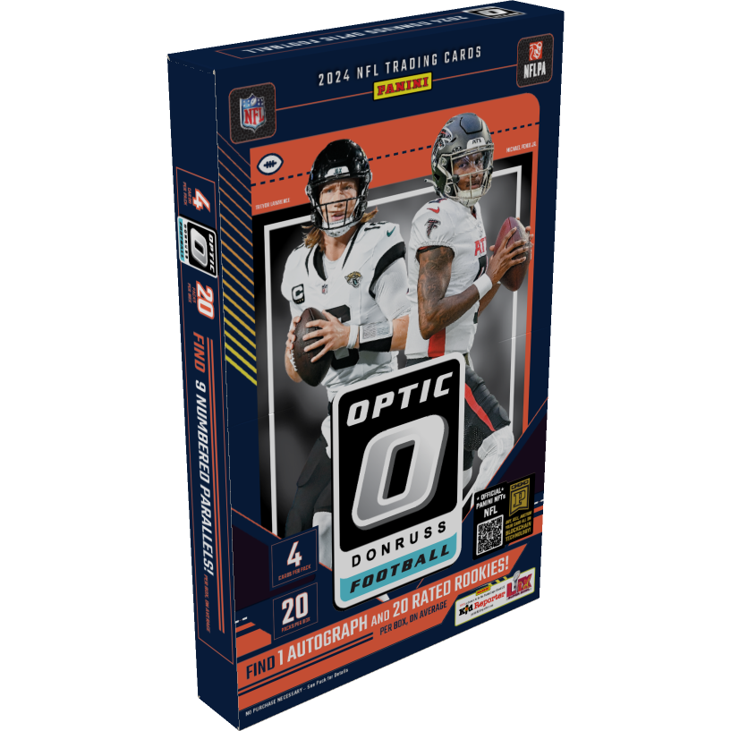 2024 Donruss Optic Football Hobby Edition – 20 packs per box, 4 cards per pack. Find 1 autograph, 20 Rated Rookies, 12 parallels (9 numbered), and 4 inserts per box!