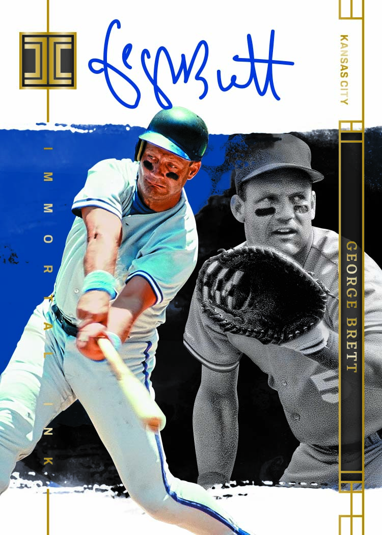 Artistic autographed cards showcasing players like George Brett. This unique set combines player signatures with creative designs, offering a fresh take on autograph cards.