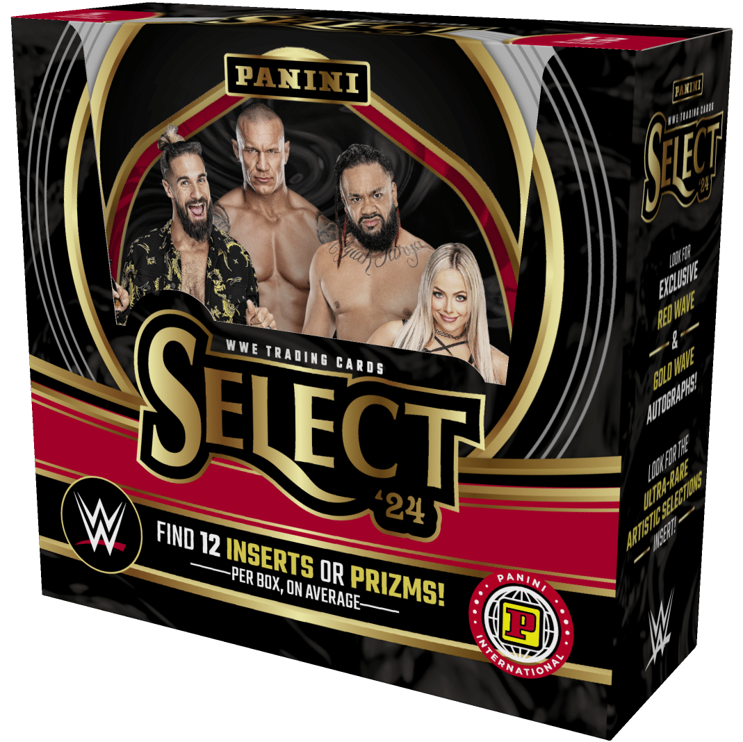 Panini’s collector-favorite Select brand returns to WWE with an international-exclusive release featuring a stunning three-tiered base set and distinctive wave prizm technology. This premium release delivers an average of 12 inserts or parallels per box, showcasing WWE’s biggest superstars of past, present, and future through Select’s signature opti-chrome technology.