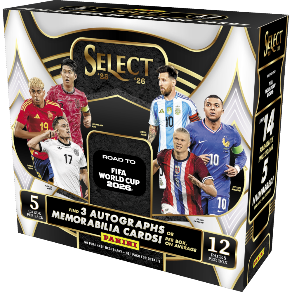 2025-26 Panini Select Road To FIFA World Cup 2026 Soccer Hobby brings the iconic Select brand to soccer fans as the world prepares for FIFA World Cup 2026. This Hobby-exclusive release showcases 30 national teams with a collector-chased 250-card tiered base set—Terrace, Mezzanine, and Field Level—plus a colorful spectrum of exclusive parallels. Each box delivers 3 autographs or memorabilia cards, including signers like Kylian Mbappe, Lionel Messi, Erling Haaland, Neymar Jr., and more. Collectors can hunt rare inserts such as Stained Glass, Artistic Impressions, Visionary, and Team Badges—highlighted by case-hit rarity—making this a must-have for soccer elite and World Cup dreamers.