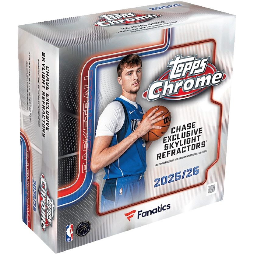 2025-26 Topps Chrome Basketball Fanatics Mega Box delivers exclusive Skylight and RayWave parallels, plus a shot at SSP case hits! Each box has 7 packs with 4 cards per pack, including two refractors, three inserts, and a rookie-packed 299-card checklist with top stars and legends. Collect rare hits in every box!