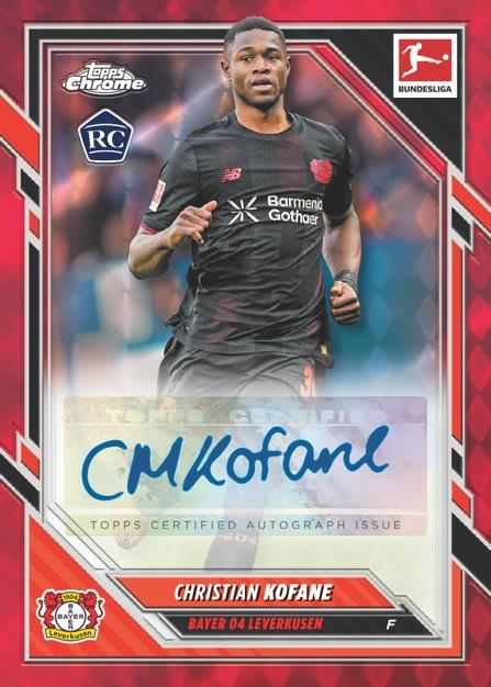 2025-26 Topps Chrome Bundesliga Soccer Breaker’s Delight marks the debut of the first breaker-exclusive Chrome Bundesliga box, loaded with vibrant Chrome color and exclusive content. Each box delivers 1 Chrome Autograph, 2 Geometric Parallel Autographs (all Breaker exclusive), and a spectrum of Bundesliga’s hottest rookies and stars. Rookies like Lennart Karl, Luka Vušković, Yan Diomande, and Saïd El Mala headline the set alongside elite names such as Harry Kane and Karim Adeyemi. First-time on-card autographs bring serious collectability, while the famous Anime, Helix, and All Etch Rookie Rush inserts, plus case-hit chases, fuel a premium rip for Bundesliga collectors.