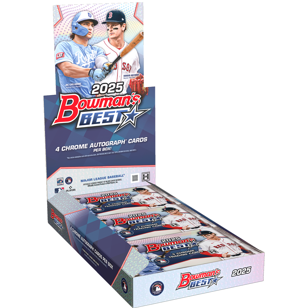 2025 Bowman’s Best Baseball Hobby offers 4 guaranteed Chrome autographs per box and bold chrome designs. Each Hobby box has 12 packs of 5 cards. Chase a deep rainbow of refractor parallels, premium inserts, and dynamic rookie and prospect content. Look for exclusive Strokes of Gold SSPs and Best-Tek inserts found only in this SKU.