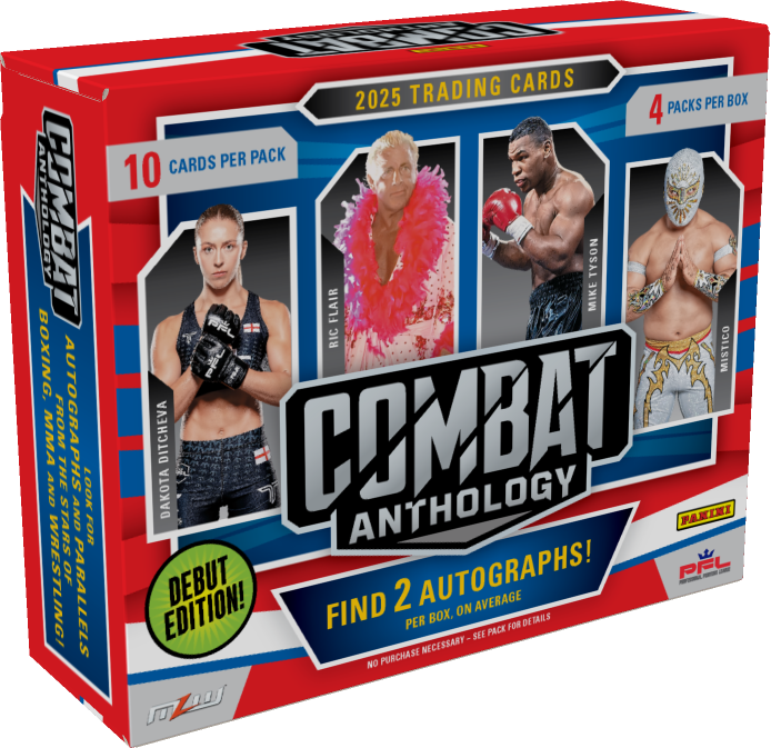 2025 Panini Combat Anthology makes a dynamic debut, uniting the best of boxing, MMA, and pro wrestling in a collector-focused Hobby release. This all-new anthology brings 2 autographs and 20 inserts or parallels per Hobby box, packed with exclusive chase elements. Find cards and autographs from enduring combat legends and icons, including Ric Flair, Hulk Hogan, Mike Tyson, Fedor Emelianenko, and Butterbean. Whether you chase hard-hitting boxing champs, MMA titans, or wrestling superstars, this release celebrates the top fighters, showcases deep checklist variety, and elevates your combat sports collection.