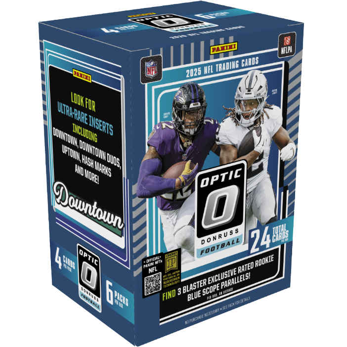 2025 Panini Donruss Optic Football Hobby Blaster delivers 3 exclusive Rated Rookie Blue Scope Parallels per box. Each Hobby Blaster offers standout rookie and star content, exciting insert sets, and the chase for ultra-rare Downtowns. Iconic Optichrome technology and deep NFL checklists await.