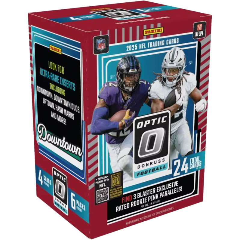 2025 Panini Donruss Optic Football Target Blaster delivers 6 packs of 4 cards, including 3 exclusive Rated Rookie Pink Parallels per box. Chase the ultra-rare Downtown insert and top rookies and stars. Deep checklist features elite rookies and NFL legends. Rookie-focused, Optichrome finish, Blaster exclusives!