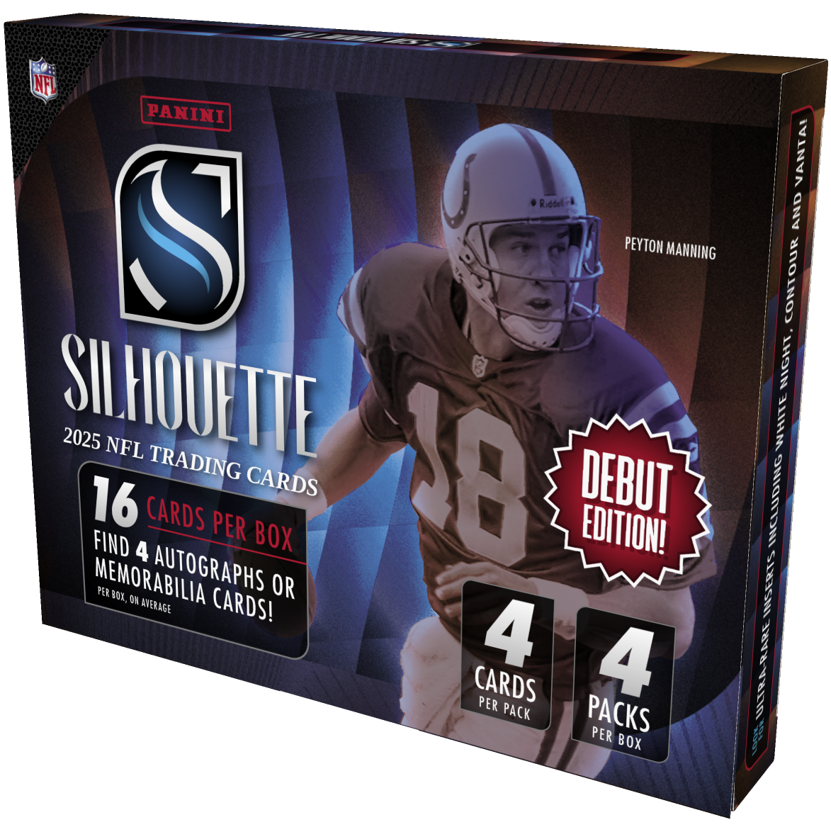 Experience 2025 Panini Silhouette Football—every Hobby box delivers 4 autographs or memorabilia cards, plus 4 parallels or inserts! Chase ultra-rare White Night, Contour, & Vanta inserts and discover must-have rookie and legend content. Impressive NFL checklist and exclusive premium memorabilia highlights.