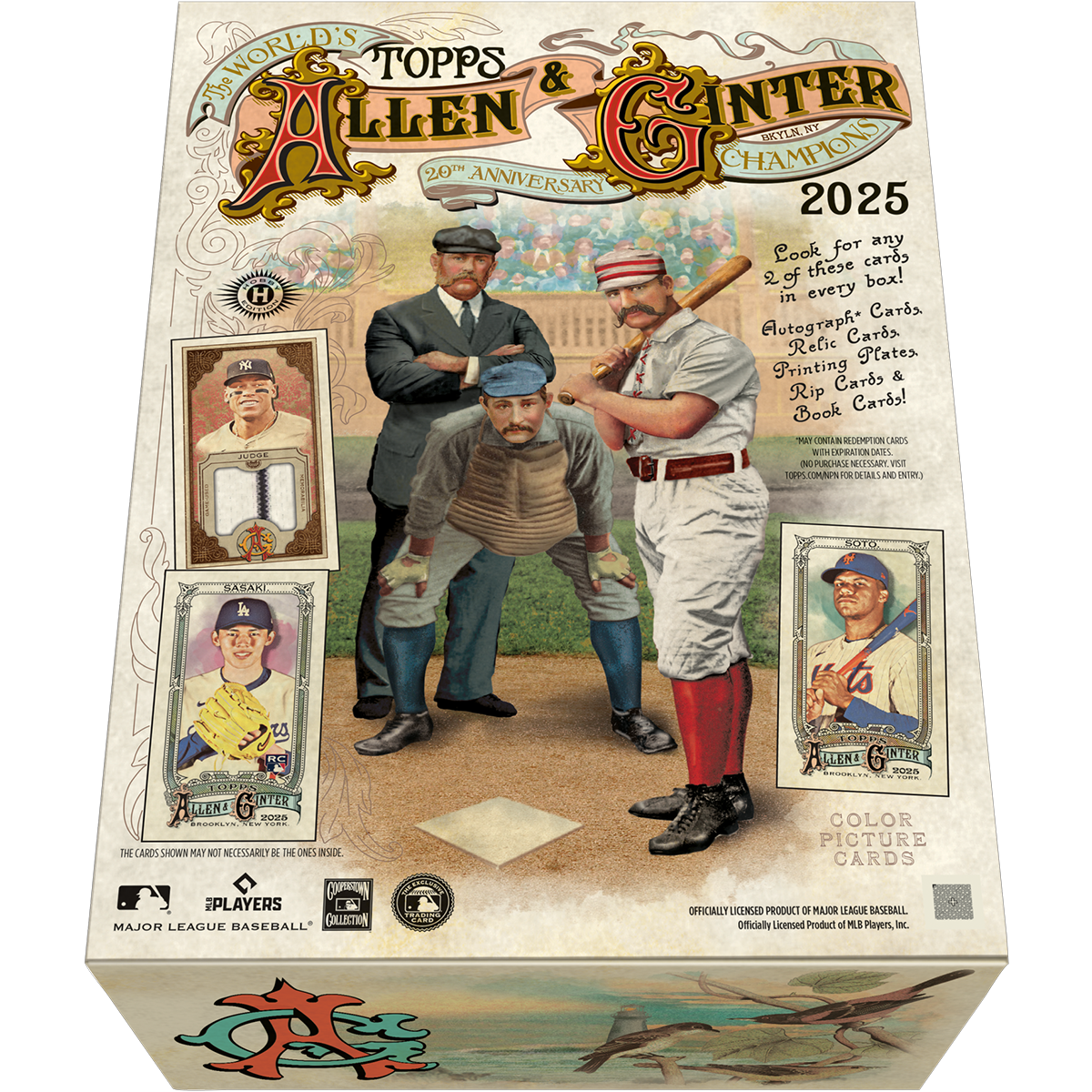 2025 Topps Allen & Ginter Baseball Hobby celebrates the brand’s 20th anniversary with an eclectic mix of cards featuring MLB rookies, current stars, legends, and pop culture icons. Every Hobby box guarantees 2 hits, including an array of on-card autographs, framed relics, cut signatures, and rip cards—plus Hobby exclusives like mini wood parallels, dazzling mini inserts, and ultra-rare DNA relics. This deep and varied checklist showcases major names such as rookies James Wood, Jacob Wilson, Dylan Crews, Coby Mayo, Kevin Alcántara, and superstars Mike Trout, Juan Soto, Gunnar Henderson, Vladimir Guerrero Jr., and Aaron Judge.