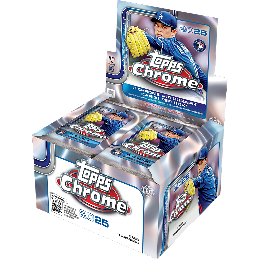 2025 Topps Chrome Baseball Jumbo delivers 3 autographs per box and a loaded 12-pack format. Look for 1 case hit insert per case, Chrome All-Etch Rookie Rush exclusives, plus a deep 300-card checklist packed with rookies and stars. Chase SSPs, colorful chrome parallels, and on-card autos throughout this Hobby release.