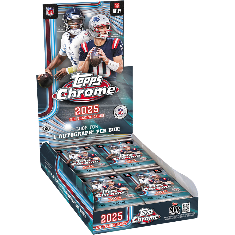 2025 Topps Chrome Football Hobby returns NFL cards to Topps with 1 Rookie Patch Autograph or Dual Autograph per box. Find on-card rookie & legend autos, exclusive Hobby inserts like Radiating Rookies & Kaiju, and a deep set loaded with stars. Hunt Chrome parallels, milestone patches & more.