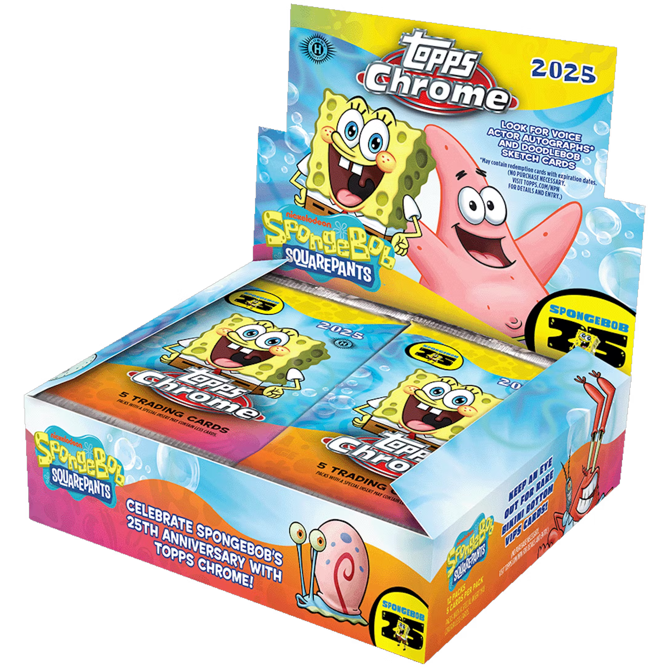 2025 Topps Chrome SpongeBob 25th Anniversary Hobby celebrates 25 years of SpongeBob! Find 12 packs per box, rare autographs, sketch cards, color refractors, and ultra-rare case hits. The 200-card checklist spotlights iconic characters, rookies, legends, and exclusive inserts for every collector.