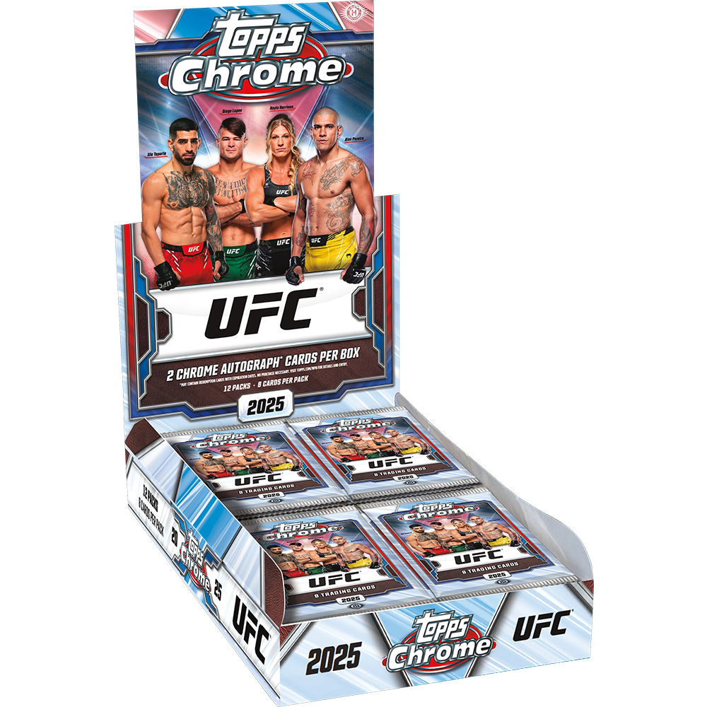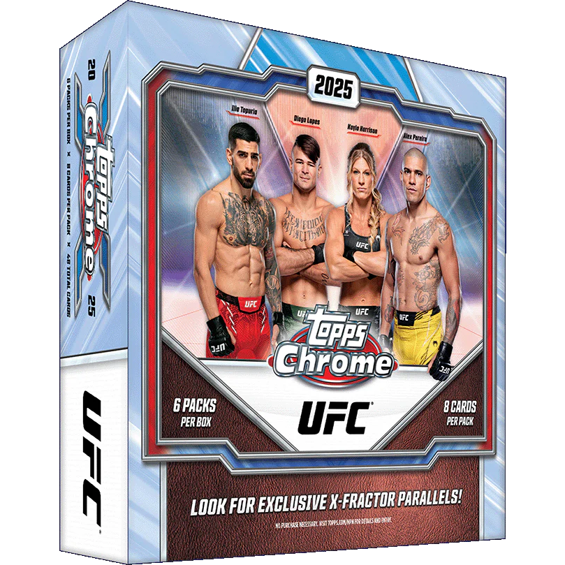 2024 Topps Chrome UFC Mega Box delivers the latest edition of UFC’s iconic chrome brand, featuring the sport’s top stars, rising rookies, and legends in a shiny 200-card set. Unique to this SKU are the X-Fractor parallels (10 per box) and exclusive Red White & Blue (#/88) and Black & Gold (#/8) refractors. Find key names like Payton Talbott, Stephen Erceg, Carlos Prates, Alex Pereira, Sean O’Malley, Ilia Topuria, and more. Each box promises rich parallel content, key UFC rookie and champion ink, case-hit Titans inserts, and a collector-friendly configuration perfect for both set builders and hit chasers.